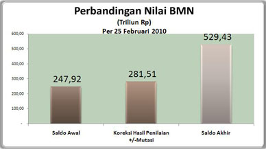 Sesuai dengan data pada portal DJKN, hasil penertiban BMN per 25 Pebruari 2010, saldo akhir penertiban BMN sebesar 529,43 Triliun. Meningkat sebesar 47% dari nilai saldo awal BMN pada K/L.