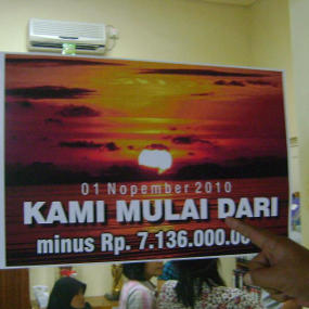 Diartikan oleh dia tulisan pada slogan itu menunjukkan bahwa keuangan Arema FC kini minus 7.136.000.000 terhitung dari 1 Nopember 2010.