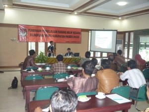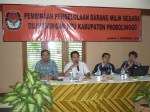 KPKNL Jember melaksanakan kegiatan pembinaan pengelolaan dan penatausahaan BMN di KPU Kabupaten Probolinggo pada tgl. 2 Desember 2010 yang diikuti 25 peserta yang terdiri dari 5 anggota Komisioner KPU dan 20 staf Sekretariat. Kegiatan tersebut dilaksanakan sesuai permohonan dari KPU Kab. Probolinggo Nomor : 208/Ses.Kab/014.657.8671/XI/2010 tgl. 22 Nopember 2010 (contoh surat, klik disini). Anggota komisioner di dampingi Sekretaris KPU Kab. Probolinggo, Teguh, menyampaikan bahwa kegiatan pembinaan ini merupakan salah satu upaya dari KPU Kab. Probolinggo untuk melaksanakan tertib pengelolaan BMN.