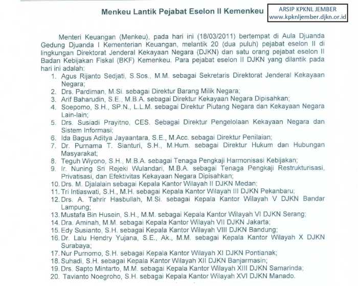 Menteri Keuangan (Menkeu), pada hari ini (18/03/2011) bertempat di Aula Djuanda Gedung Djuanda I Kementerian Keuangan , melantik 20 pejabat eselon II di lingkungan Direktorat Jenderal Kekayaan Negara. Para pejabat yang dilantik pada hari ini adalah :