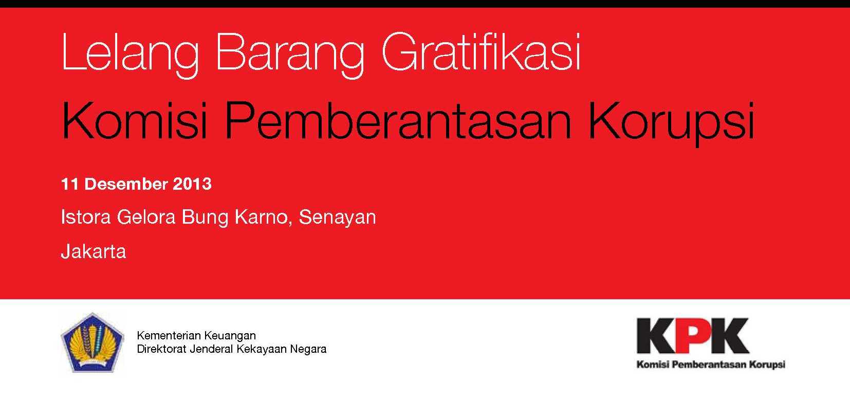 Kementerian Keuangan c.q. Direktorat Jenderal Kekayaan Negara melalui Kantor Pelayanan Kekayaan Negara dan Lelang (KPKNL) Jakarta V, akan melaksanakan penjualan lelang barang milik negara yang berasal dari barang gratifikasi Komisi Pemberantasan Korupsi (KPK) dengan ketentuan sebagaimana tercantum dalam lampiran pengumuman dan katalog dibawah ini.