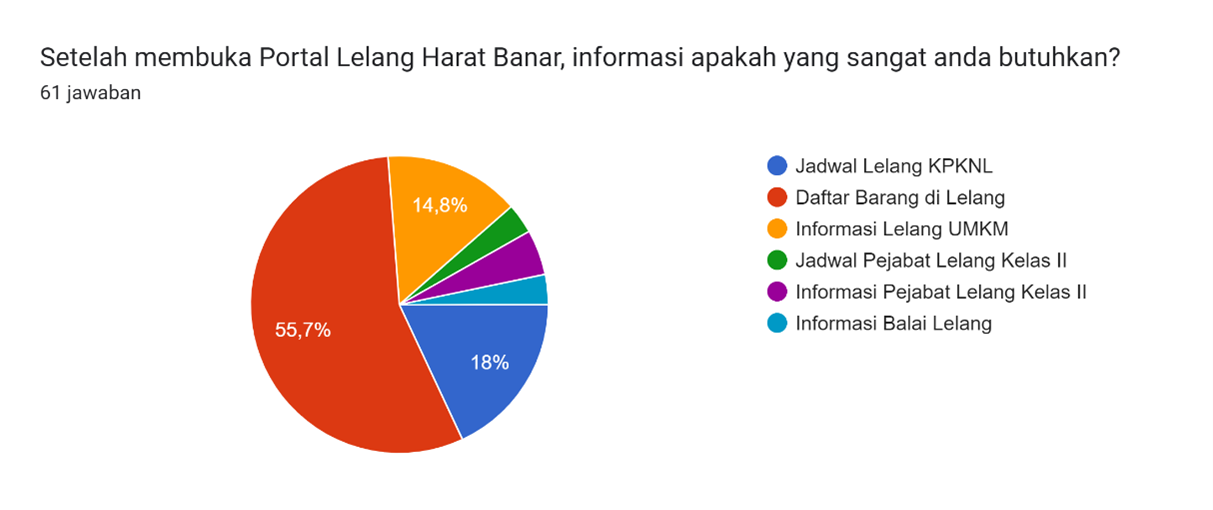 Sebanyak 55,7% masyarakat membutuhkan informasi atas daftar barang yang di lelang, dengan adanya integrasi ini, masyarakat dengan sangat mudah mendapatkan informasi barang yang di lelang melalui Portal Lelang Harat Banar.